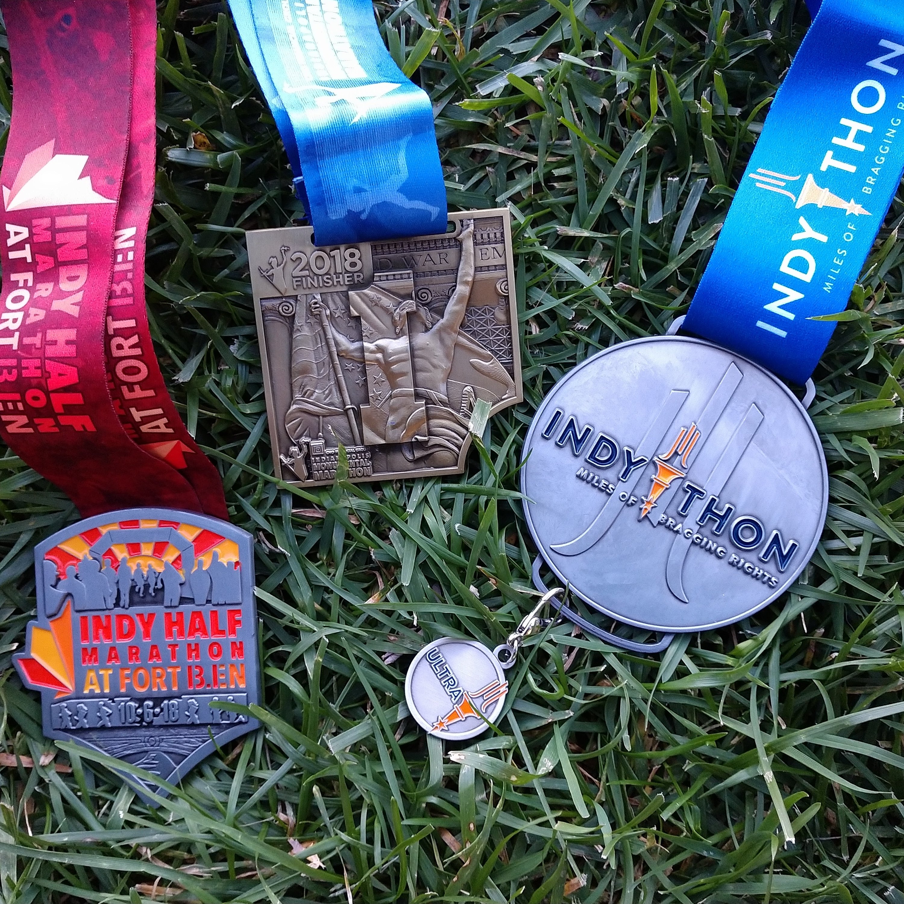 It wasn’t 4:20 or 4:30, but it’s still the fastest I’ve ran a full marathon to date. Even better is that the Indy Monumental is united with the Indy Half at Fort Ben, so for runners who complete both events, they get the INDYTHON medal for first-timers and corresponding charm for whatever the total distance between the two is. Since I ran the half at Fort Ben and full on Saturday, I got the 39.3 miles charm as an “Ultra” runner.