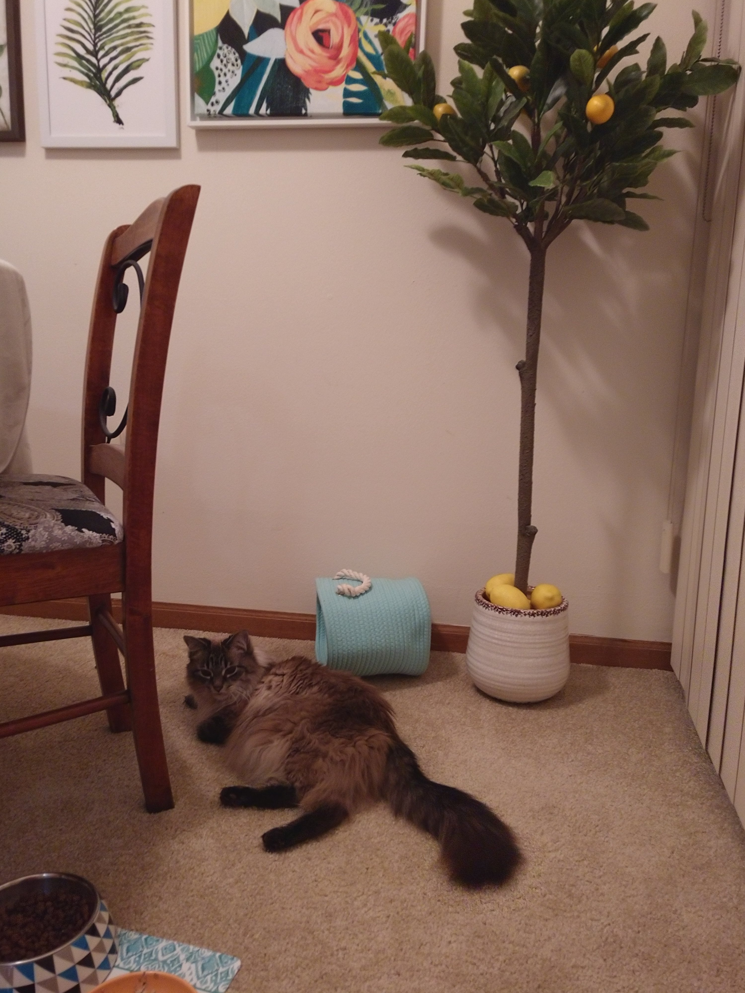 So I slept like crap on Friday, and had the cat waking me up at her normal time Saturday morning for breakfast. A few parents are going to roll their eyes, but for those of you who have never owned a cat: they’re basically the same as toddlers. They only think of their own basic needs and to hell with you wanting to sleep in on the weekend. Whilst grumbling obscenities I got her breakfast and then fell asleep on the couch until a quarter after 6. While Marina is a self-absorbed cat, I discovered when I woke up that she isn’t without a conscious, as she was keeping an eye on me from her chair.