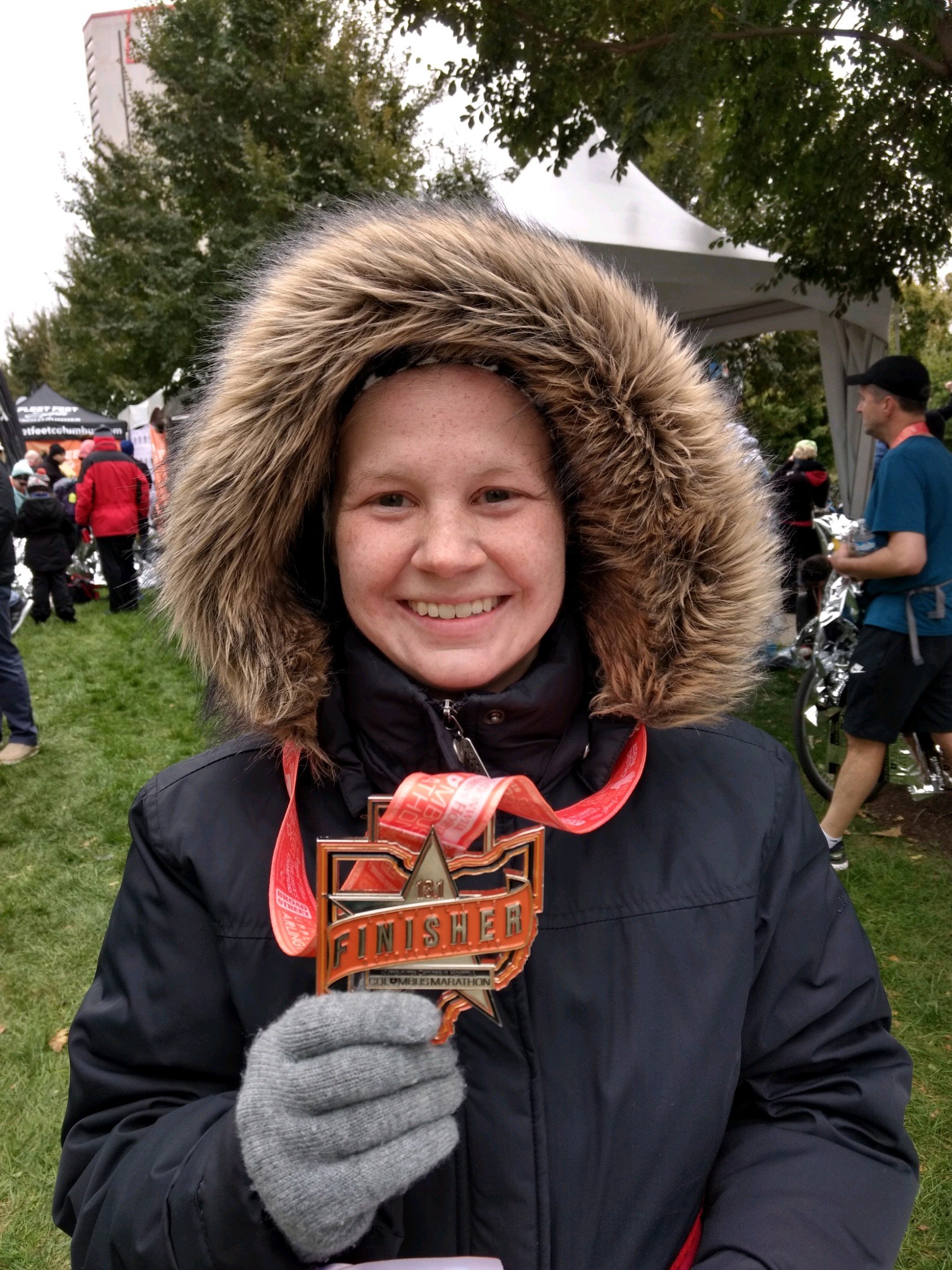 Two weeks later on October 21st was the Columbus Half. While Fort Ben was hotter than Hell, Columbus was 25 degrees that Sunday morning. Mom and I were freezing and I debated running in my puffer coat, wearing it back in the corrals while we waited to go. I decided not to wear it after all and managed the most flawless pass to my mom in the crowd.