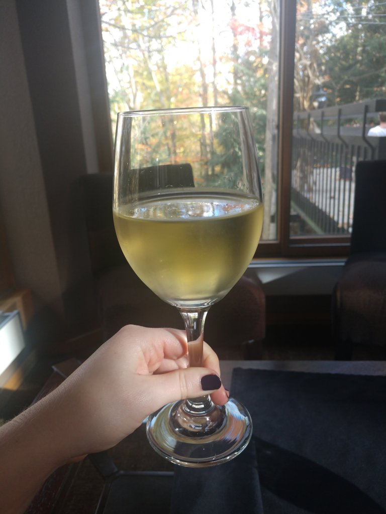 The roads were beautiful, lined with goldenrod and fiery orange. After check in we had our hors d’oeuvres and wine – a baked brie spread, with a Riesling for me and a Malbec for him. I’m not a big wine fan, although I was impressed with my Riesling. Our room was ready and we got there to get changed before dinner at 6.