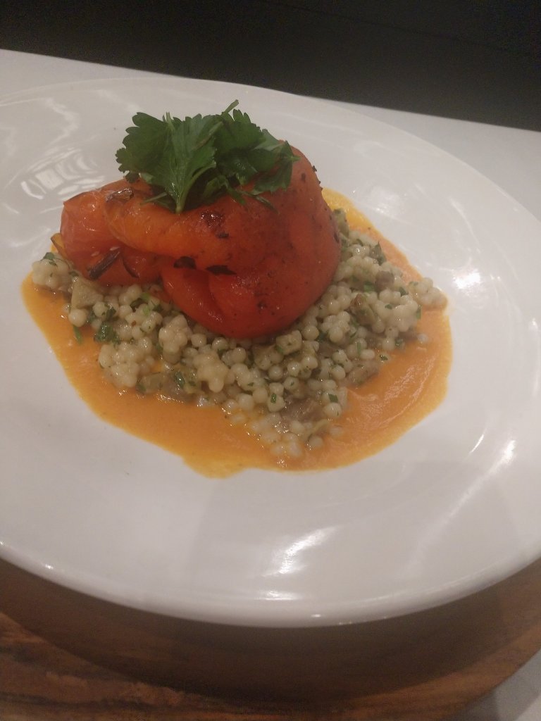 I wasn’t in a meat mood, so I decided to order the fire roasted red bell pepper minus the capers. The pepper came over cut eggplant and Israeli couscous served in a tomato sauce. It was delicious and refreshing.