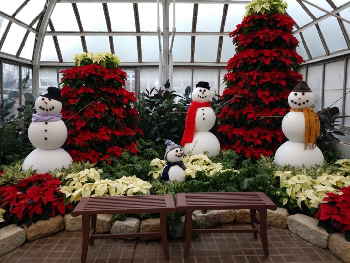 The conservatory isn’t too far from my complex, and the first Sundays of the month being free to Franklin County residents is a wonderful perk. Each December is Holiday Blooms, where poinsettias fill the conservatory in unique colors and arrangements. I took the picture of the snow family when I was visiting in 2018, and taking in the beauty of the poinsettias, as well as the palm house, and the dessert, rainforest and Himalayan mountain biomes (Himalayan is my favorite one of all three. I need to drag Sam there soon.)