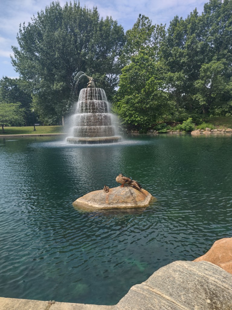 Goodale Park was my Mile 9, and at this point I completely bonked. The best idea was to walk through the park and around the pond to say hello to the two elephants atop the water fountain, so I did that. I also said hi to the duck family on the rock and took a quick picture of them for my boyfriend.