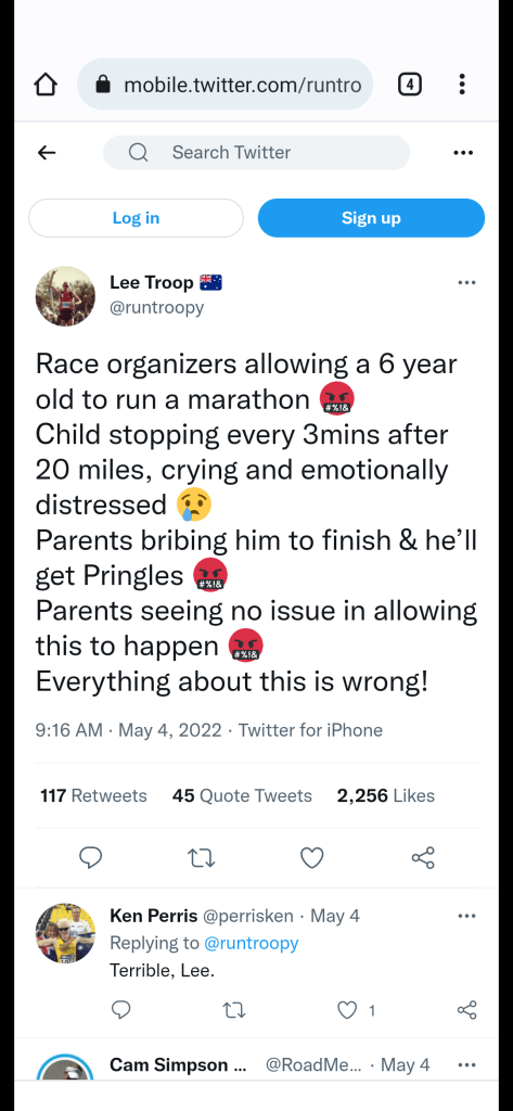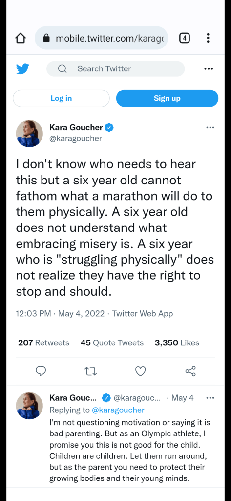 I have a feeling the people supporting the parents have never trained for and ran a marathon, so I’ll share a tweet from American long-distance runner Kara Goucher – a marathoner who represented the U.S. at the 2008 and 2012 Olympics. Her thoughts sum up what those of us who have actually ran a marathon or two or ten before think about a child participating in the distance: