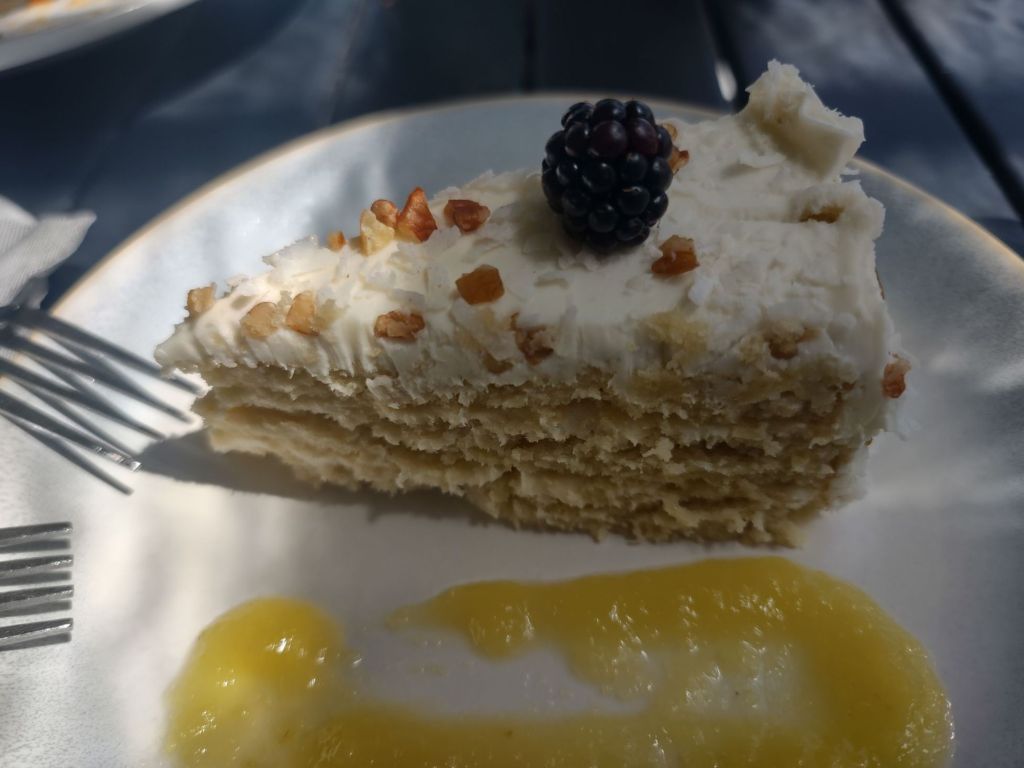 Since I was there, I decided to order some dessert. It was a toss up between the Key Lime Stacker Cake and the Hummingbird Cake, and ultimately, Hummingbird won. Hummingbird cake is a tropical version of carrot cake with cream cheese frosting, and consists of crushed pineapple, pecans, coconut and banana. Juniper serves their cake with a grilled pineapple relish. I’ve never had hummingbird cake before and was wondering if one of the flavors would be stronger than the others. It turns out the flavors in the cake are all married together so one doesn’t overpower the other. I tasted a bit of coconut in the frosting, which was a delightful surprise since I love coconut.