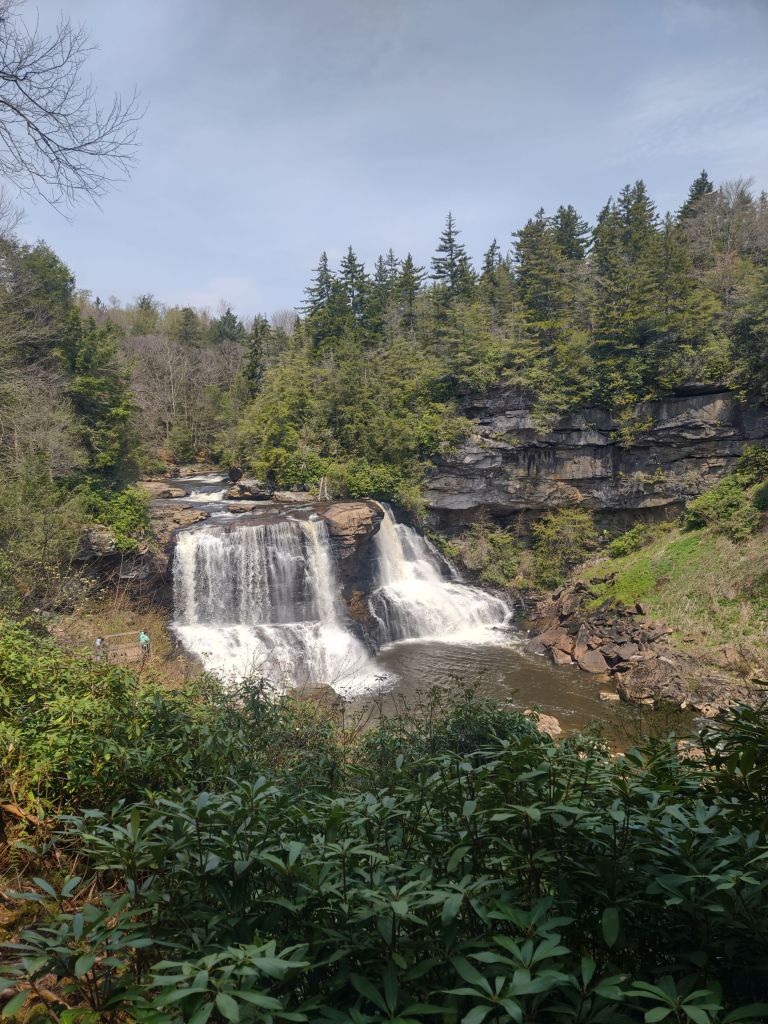 About 15 minutes up the road from the lodge is Blackwater Falls State Park, home of Blackwater Falls, where the river of the same name leaves its calm course in Canaan Valley and enters the sprawling Blackwater Canyon. Mom and I got to the park a little after noon and first stopped at the falls trailhead, where we walked down the stairs and boardwalk to observe the falls.