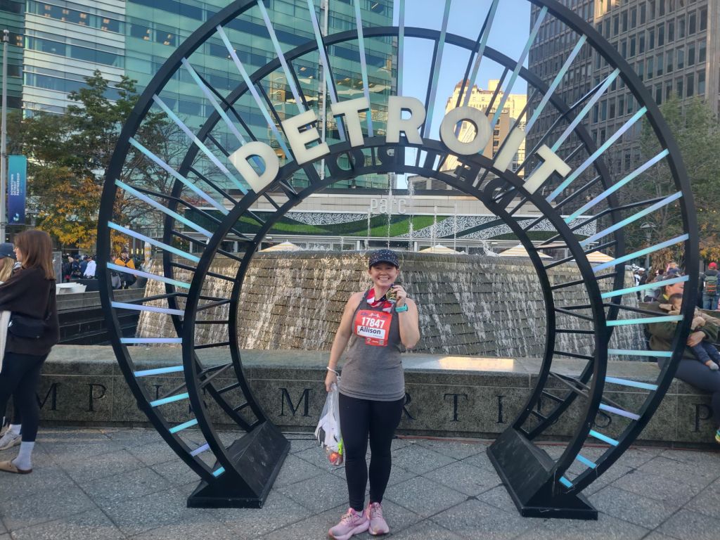Miles 8 until the finish line wound me through Midtown Detroit. I was still feeling strong and surprised myself by only needing two short walking breaks (coming up the bridge and coming back up from the tunnel.) I even got a jolt of energy during the last mile and decided to forgo my gel, which didn’t bite me. I was in the home stretch, feeling great and keeping myself going with the infectious crowd support. I saw the finish line right around the corner and it finally registered: I just ran the Detroit International Half Marathon.